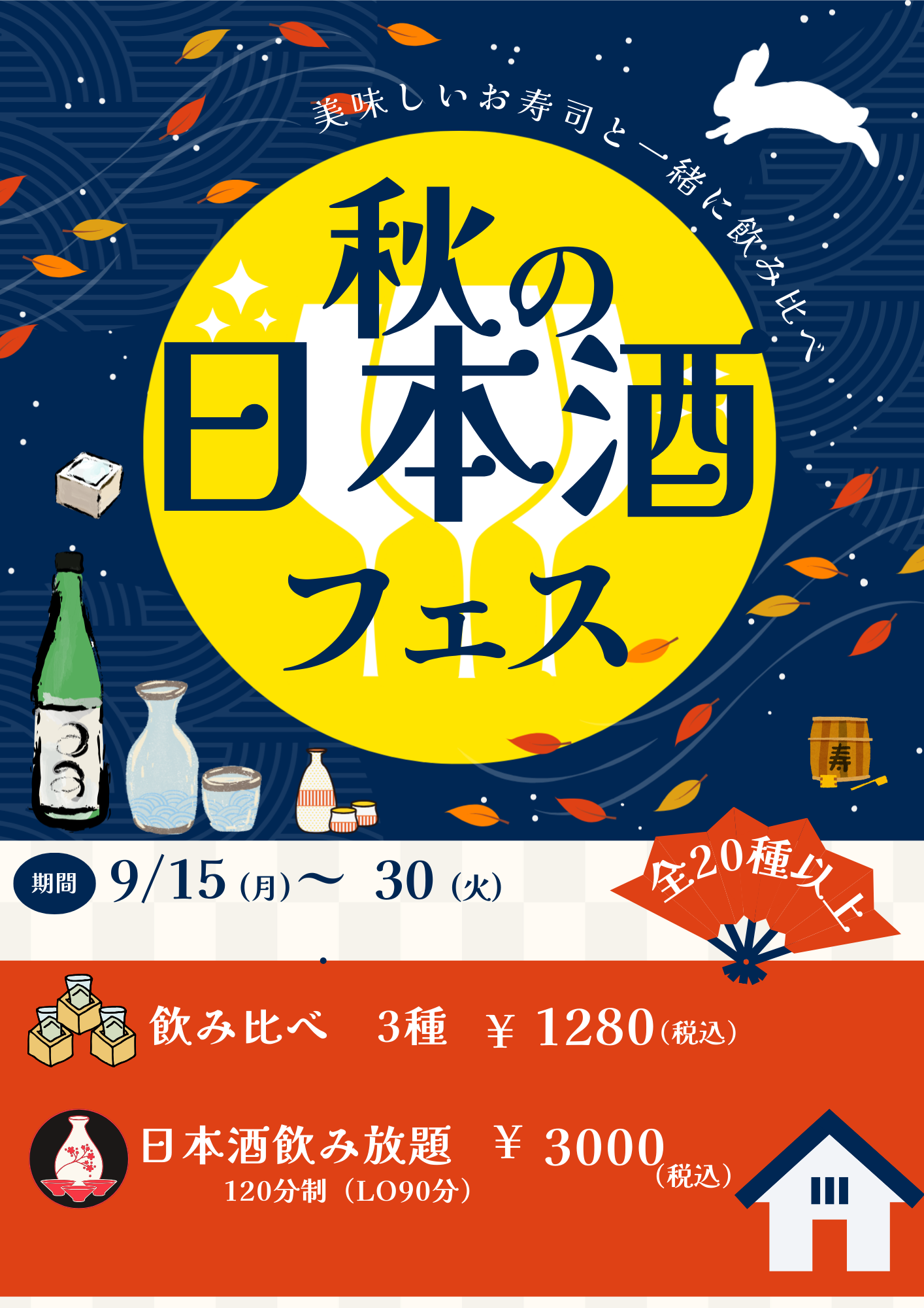 9/15~9/30迄 秋の日本酒フェス開催中!! 当店自慢の日本酒全20種類以上! 飲みくらべセット(3種類)¥1280 日本酒飲み放題120分(LO90分)¥3000 美味しいお寿司と日本酒をお楽しみください。