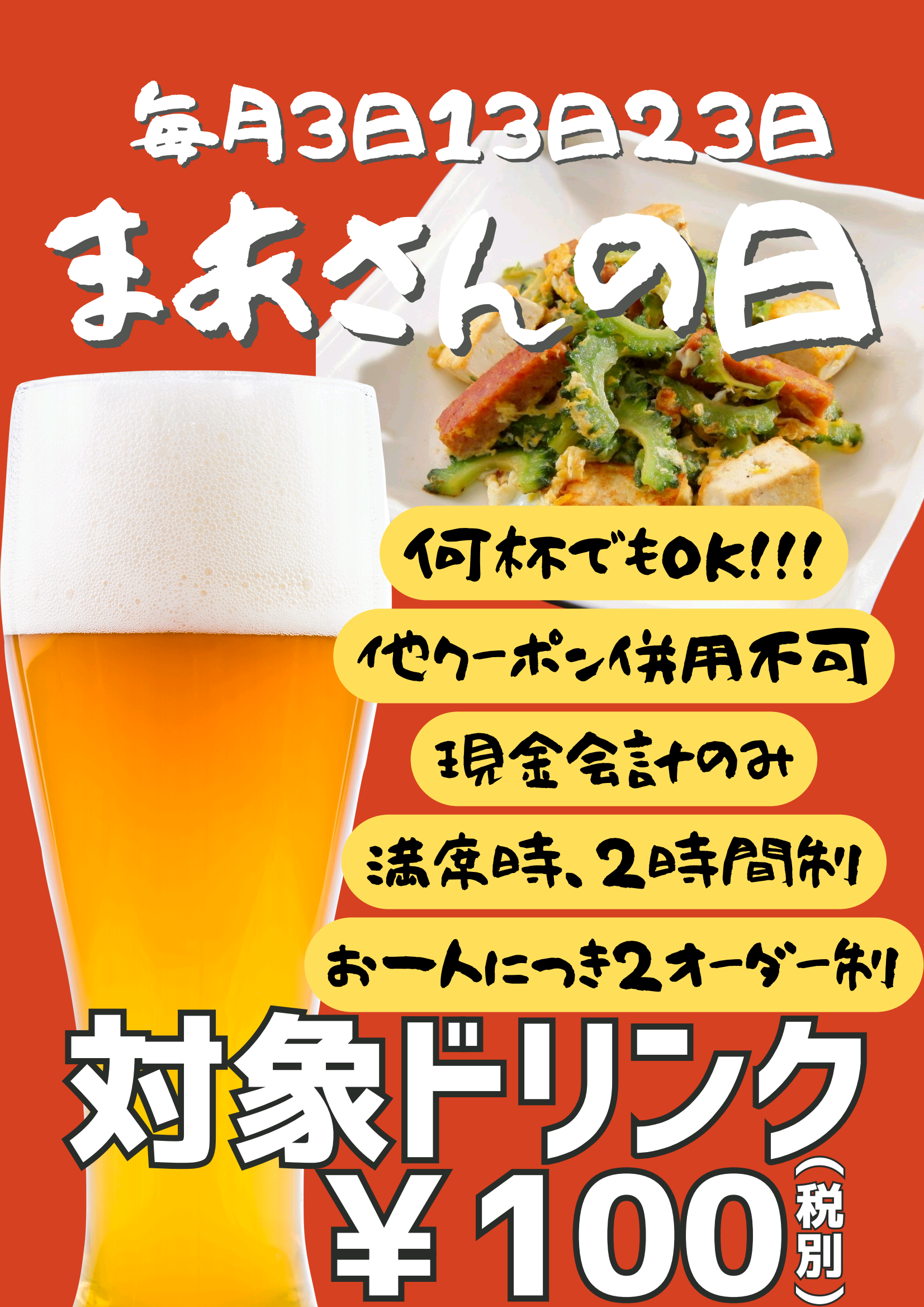 毎月3日13日23日はまあさんの日! ↑飲み放題メニューのドリンクが何杯飲んでも1杯100円! 詳細は店舗までお気軽にお問い合わせ下さい。